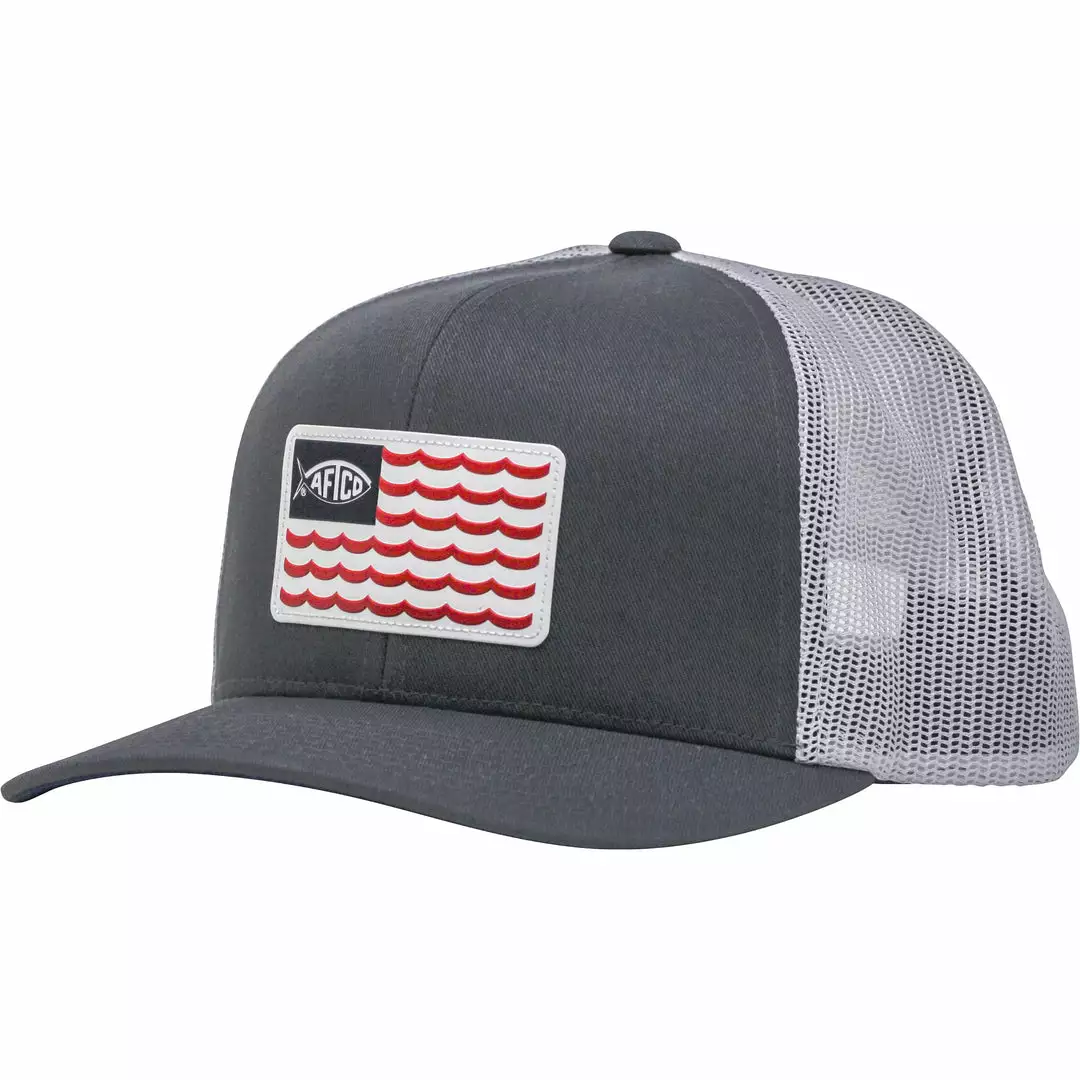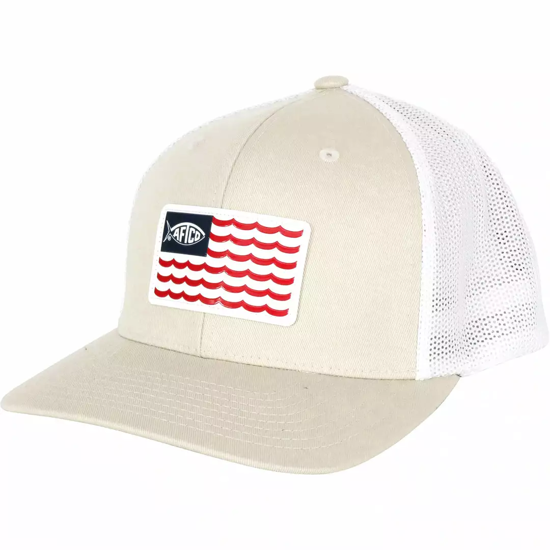 The Aftco Canton Trucker Hat comes with an AFTCO styled American flag patch with cool waves as stripes and an AFTCO fish. The 6-panel trucker comes with a mid crown fit with a snapback.