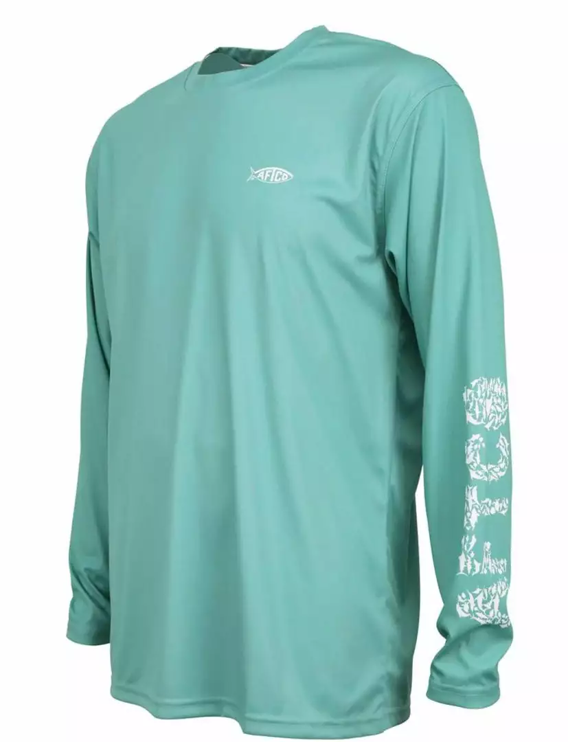 The AFTCO Jigfish UV protection long sleeve fishing shirt is one of the ultimate AFTCO shirts that protect from the harmful effects of the sun’s UV rays. This performance shirt is made of 100% polyester that features an AFTCO logo in bold text. The Jigfish tee utilizes a breathable stretch fabric known as QuickDry and blocks more than 98% of UV rays. The Jigfish UV protection shirt features an AFTCO Marlin Puzzle logo on the top back with an AFTCO Fish logo on the chest.