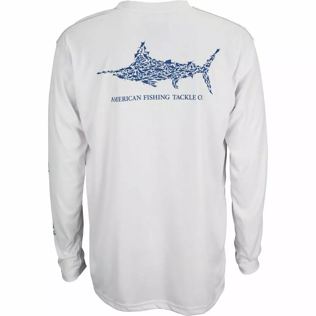 The Jigfish tee utilizes a breathable stretch fabric known as QuickDry and blocks more than 98% of UV rays. The Jigfish UV protection shirt features an AFTCO Marlin Puzzle logo on the top back with an AFTCO Fish logo on the chest.