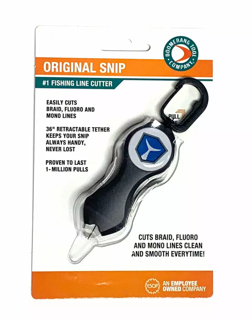 The Tackle Express Boomerang Fishing Line Cutter cuts clean and precise through braided line, mono line, and fluoro line. With the built-on carabiner, clip it to your hip or vest so it’s always handy and never lost. Snip the fishing line and let it go, the built-in tether retracts back into place until you need it again, no more looking around the boat with your hands full for a set of fishing pliers or nippers. With a Boomerang SNIP Fishing line cutter you’ll spend more time with your line in the water and less time looking for your tool.