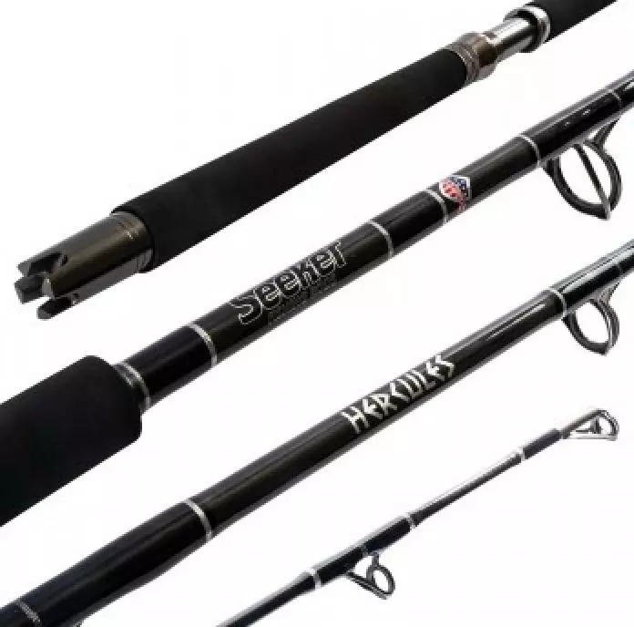 Seeker Hercules Rods are super lightweight rods and extremely powerful! Built on Devious Red “S” glass Composite blanks, the Hercules Jigging Rods are built for light weight and strength. These extreme duty rods, feature the slow action required for deep water jigging and the latest American Tackle, “Virtus” Ring Lock, Solid Titanium frame Guides, that are 60% lighter than Stainless Steel, better protect the incredibly strong Nanolite rings and eliminate corrosion. The guide wraps are black over metallic gray underwrap with gold trim bands and red accent inlays. The Reel Seats and Gimbals are either a Composite or gun metal gray Aluminum, combined with Black EVA grips.