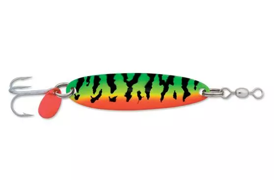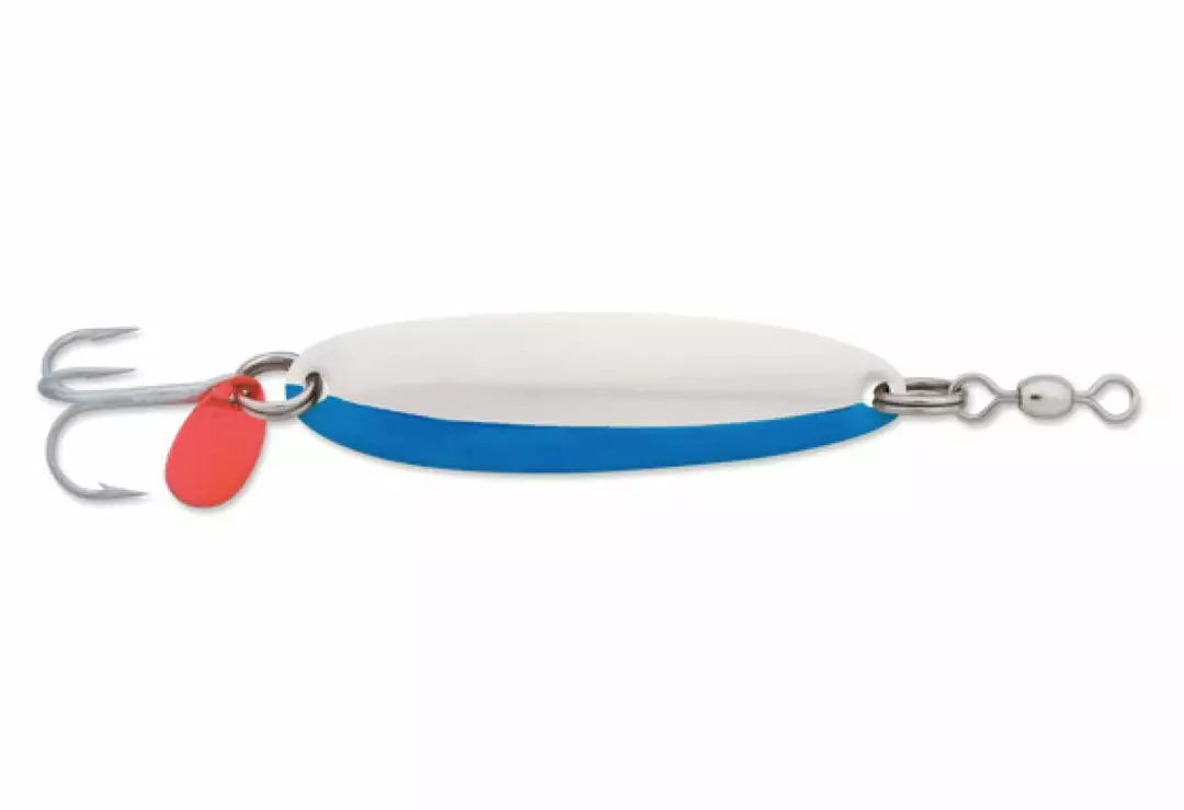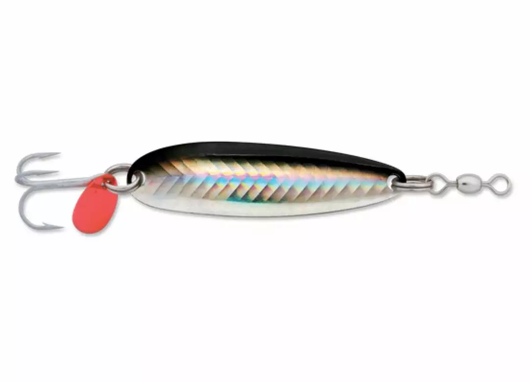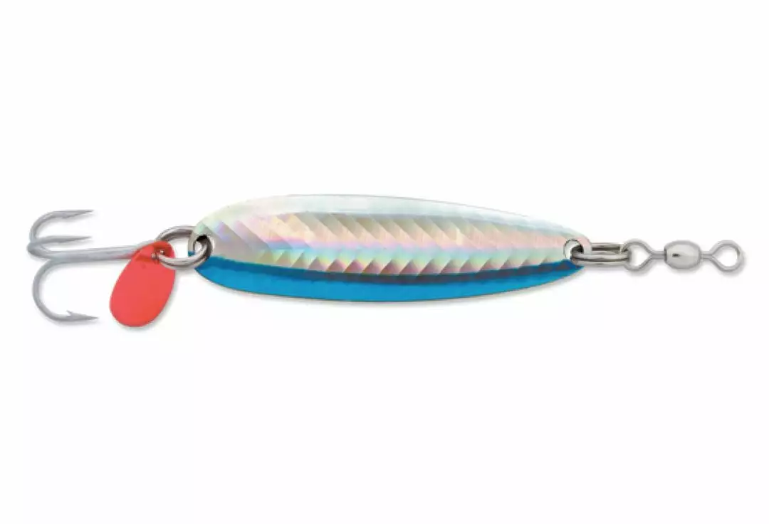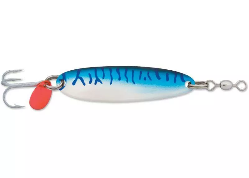 Luhr Jensen Krocodile Spoons have been a staple for many years. The fluttering action can entice fish to violently attack or just pick it up on the way down. The retrieve has a wobble action that mimics a baitfish while it flashes the different color patterns.