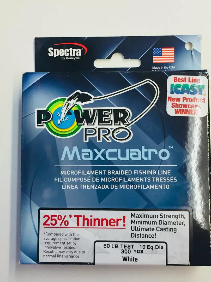 Power Pro Maxcuatro is 25% thinner than standard PowerPro lines with equivalent strength; it’s like buying a line one size smaller.