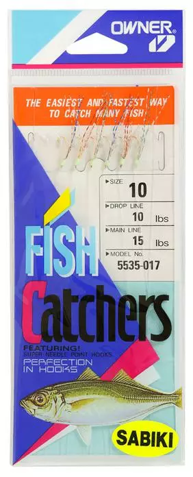 Owner Sabiki Rigs Fish Catchers 5535 come with Gold hooks green glow bead slides on each branch line; hooks dressed with mackerel skin. Rigs vary in length depending on number of hooks, but generally, 10 inches of main line stretches between 4-inch drop lines. Swivels attach at each end of rig. Each rig has hooks in varying numbers, and sizes, plus varying strengths (lb.-test) of main line and branch lines.