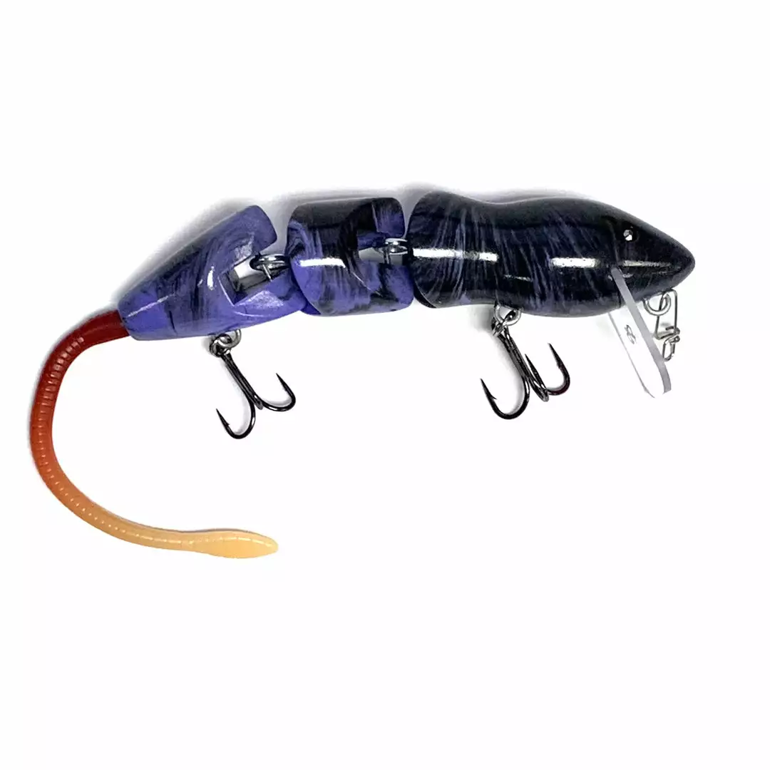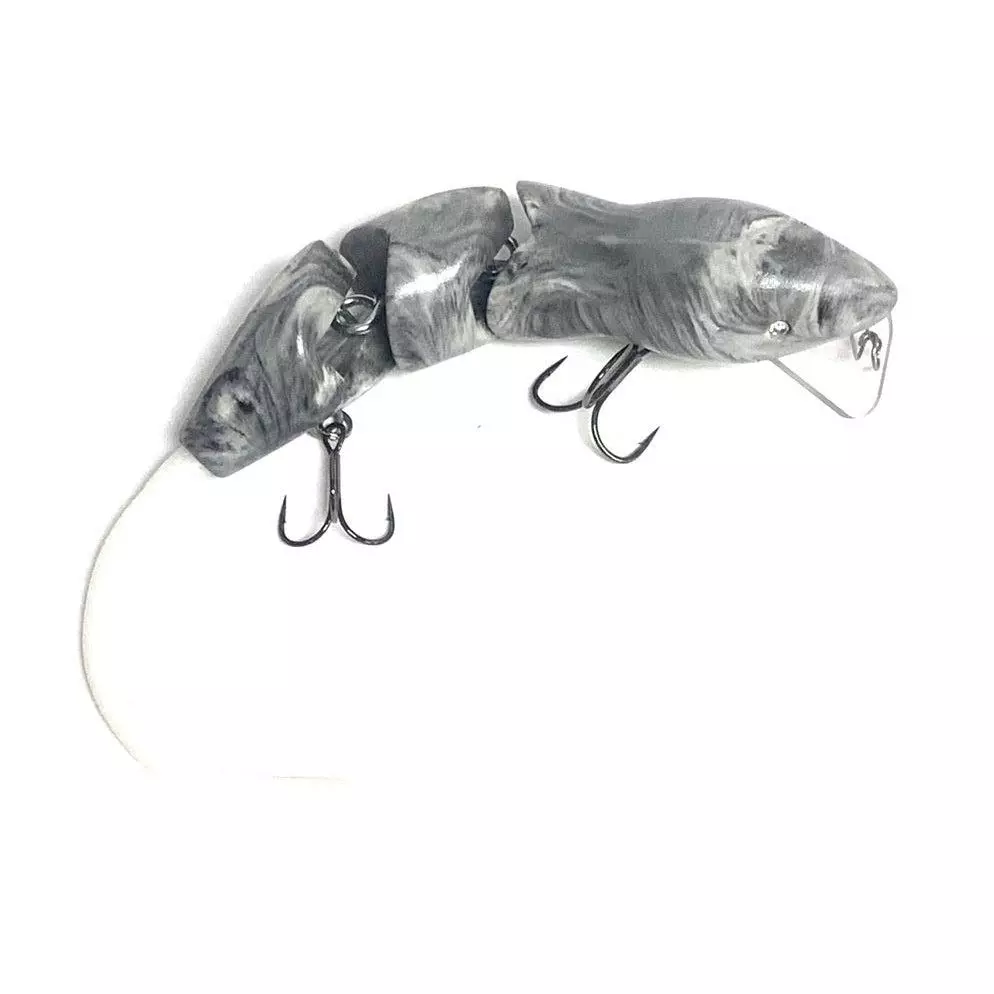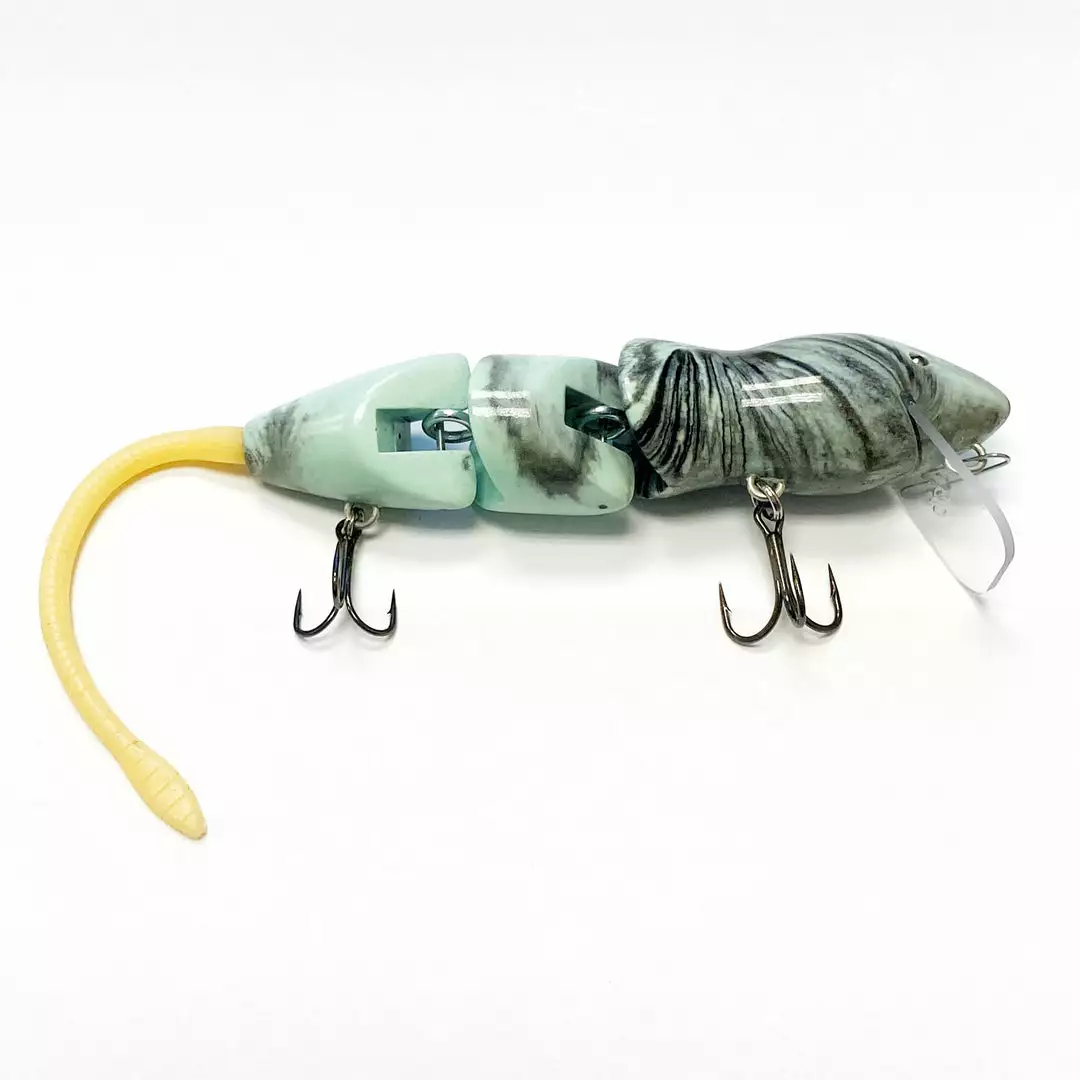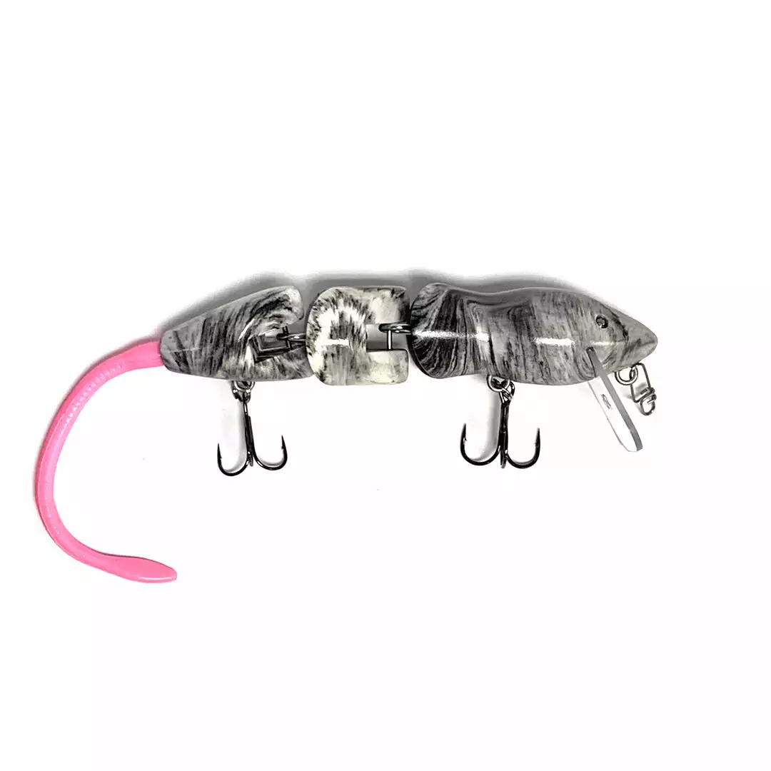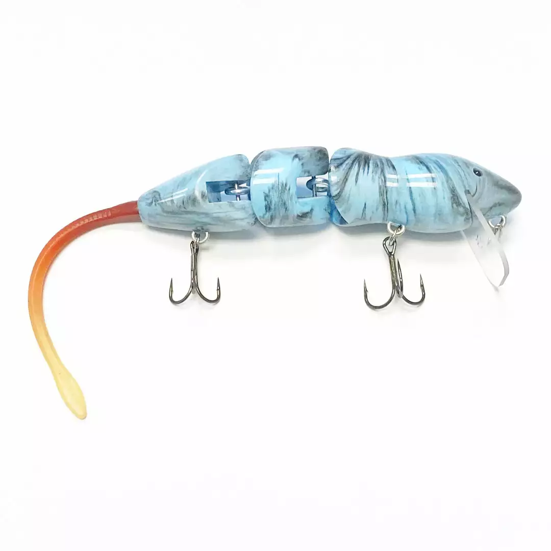 The PB Rat Wakebaits come stock with gnarley VMC Split Rings and Owner Stinger Treble size 1 in the rear and 1/0 in the front. PB Rats do come in solid colors however the swirl patterns are unique and no two swirl patterns are the same. Tail colors may vary and are held on with a screw lock and can be easily changed after being chewed.