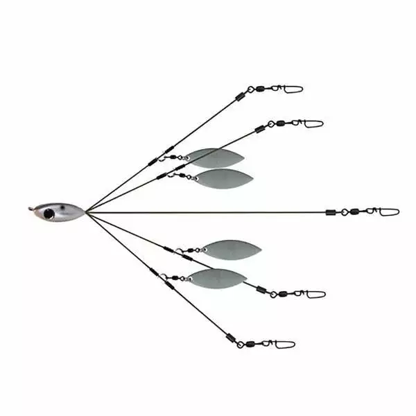 The Finesse School-E-Rig was designed with the collaboration of Elite Series Pro, Fred Roumbanis, and FLW Tour Pro, Brent Ehrler. The Bait Ball incorporates 3.5″ piano grade wires along with #3 willow blades plated in 24k gold or nickel for the ultimate flash and added vibration.
