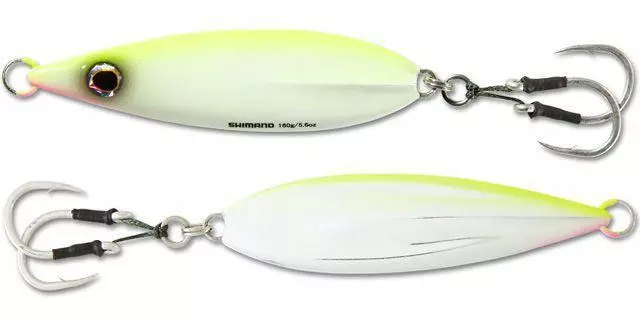 Shimano Butterfly Flat-Fall Jigs are a proven concept of Butterfly Jigging technique. Drop the jig down to the bottom, then crank it up 30 feet off the bottom and free spool. Or cast the jig and let it fall while free spooling, wait for the bite, then jerk and repeat. The center balanced jig falls with a wobbling action in a horizontal position, keeping the jig in the strike zone longer.