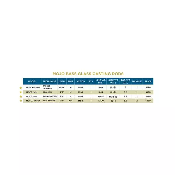 St. Croix Mojo Bass Glass rods were revamped and improved 2020. Now featuring St Croix’s exclusive integrated Poly Curve (IPC) mandrel technology and combined with super premium, 100% linear S-glass, these rods provide exemplary performance with all crankbaits including square bills, lipless cranks and chatterbaits. They excel with lures ideally matched to a moderate action rod.