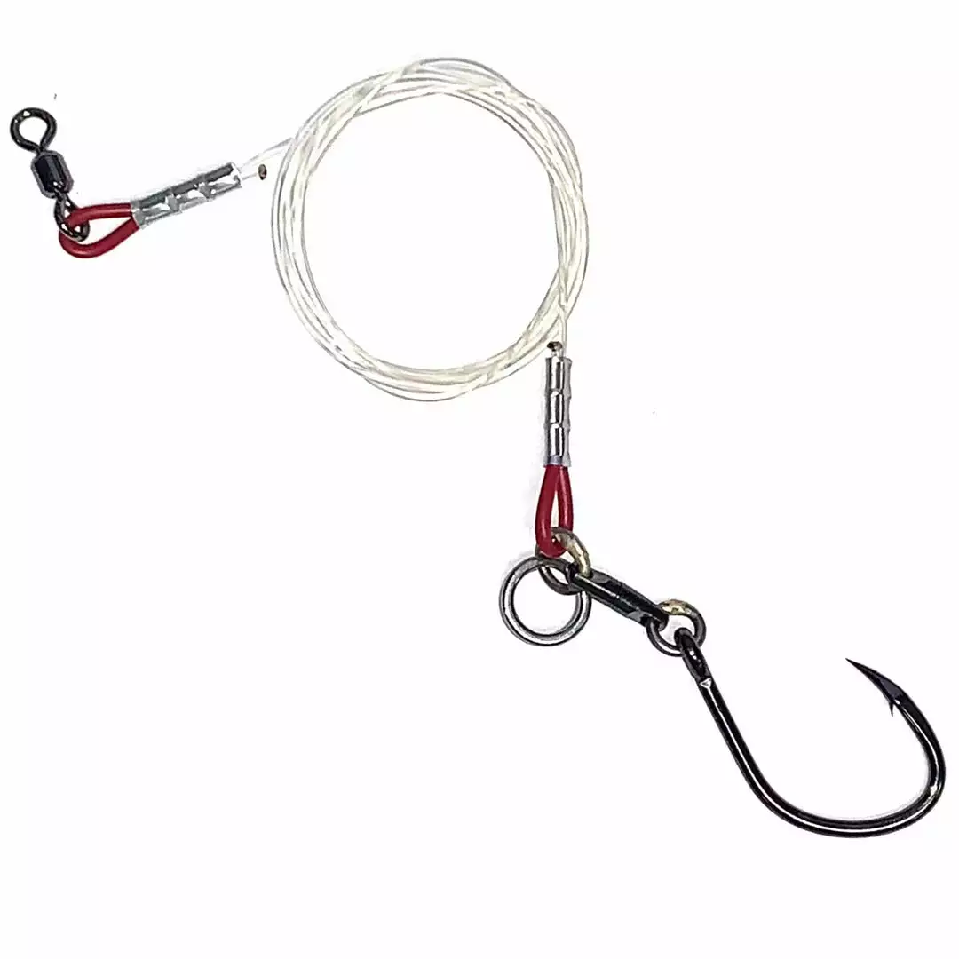 The J-arry rig can be stored easily, tied up quickly and make interchanging jigs even faster. J-arry rig consists of a heavy duty swivel on top of 200lb-300lb Fluorocarbon chafing leader to a welded heavy duty swiveling Owner Offshore Hook with a 331lb Mustad Saltism SS Split Ring to attach your jigs. This one rig will replace the need of having to rig every shape and size jig before your trip as well as making organizing and storing your jigs easier on your trip.