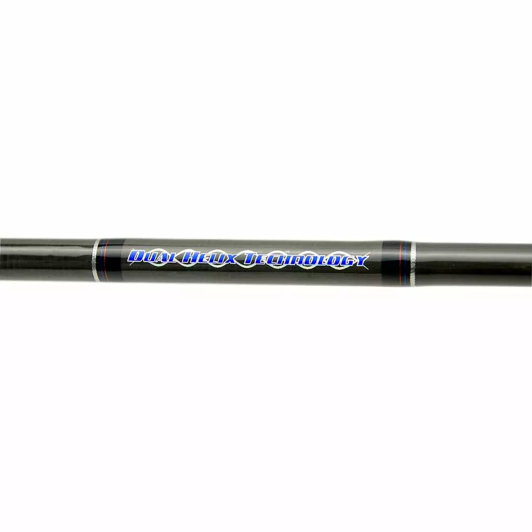 RCE Conventional+ and Spinning+ – Hypalon Grips, ALPS Aluminum Centra Lock Reel Seat, ALPS S-6 SS Deep Pressed Ring Guides, Single Black Wraps with Silver trim bands and Blue and Red Accents.